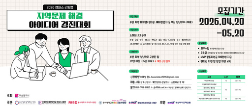 접수는 4월 20일부터 5월 20일까지 진행되며 부산 지역 대학생과 예비 창업자 등 만 18세부터 39세 이하 청년 약 50명을 팀 단위로 모집한다.